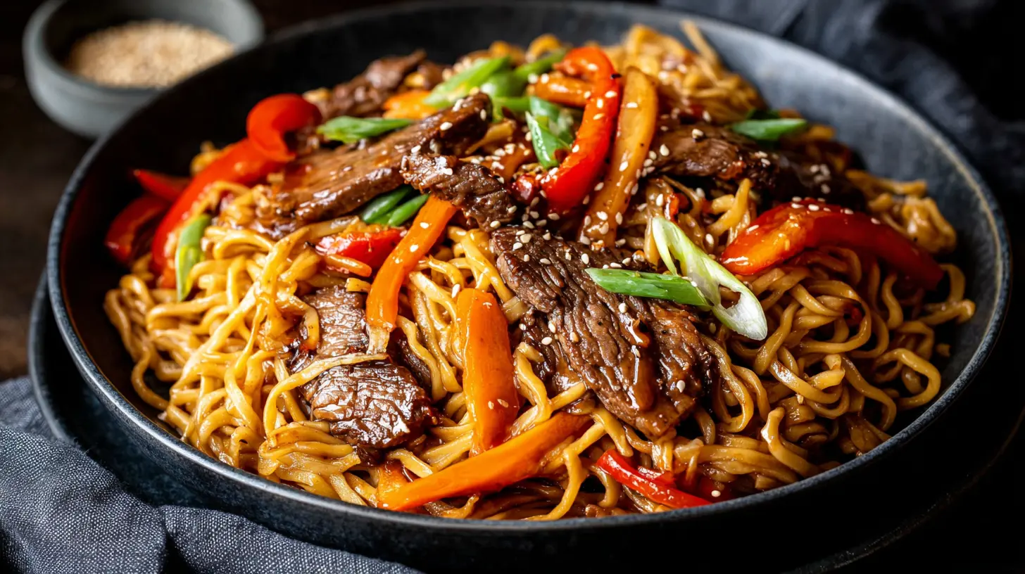 Once the veggies are just right, add the cooked beef back to the pan, then pour in your glorious homemade teriyaki sauce. Let it simmer for a minute or two, stirring gently. You’ll see it start to thicken and get that beautiful sticky glaze. It smells so good, I mean, the whole kitchen just fills with that savory sweet sauce aroma. Finally, fold in your cooked noodles, tossing everything until every strand is coated. Add some spring onions and chili flakes for a warm kick, and you’ve got a seriously comforting noodle bowl dish.